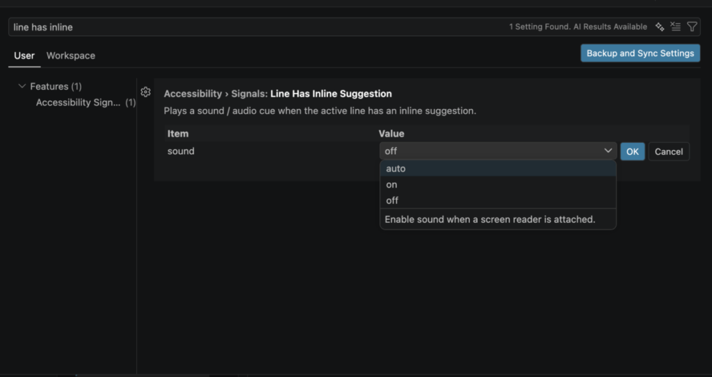 먼저 알려진 방법으로는 setting -> 검색창에 line has inline 을 입력하여 sound 를 off 로 설정이 있습니다.